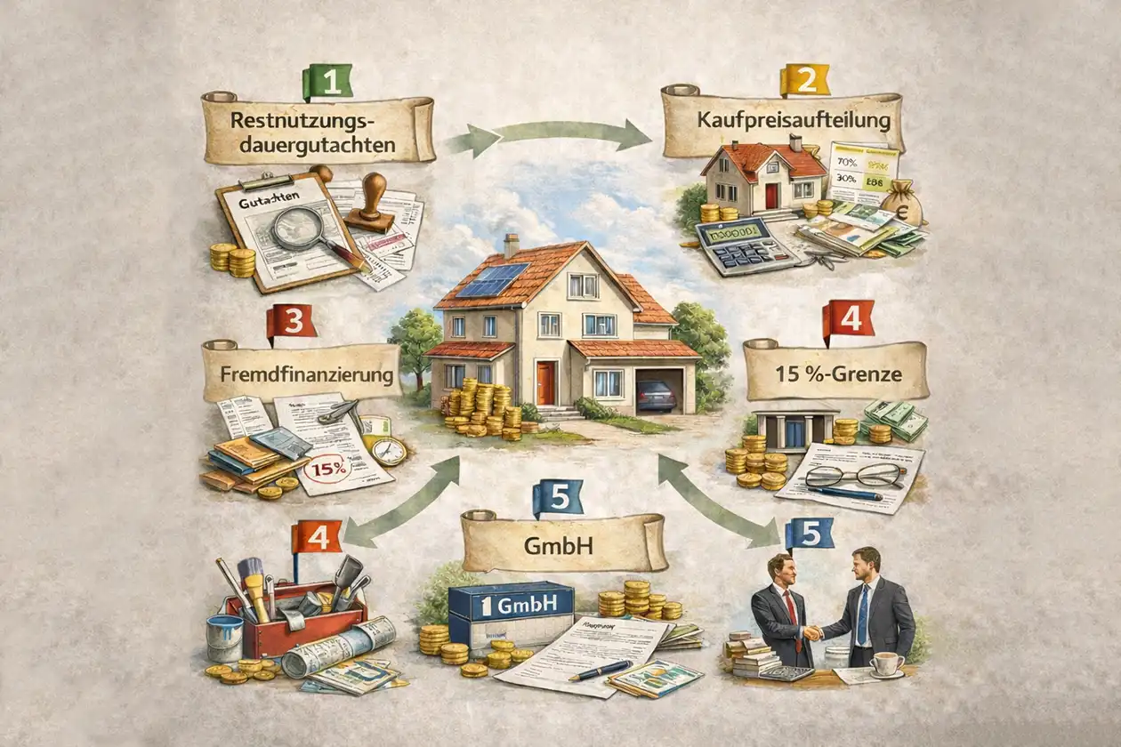 Wer Immobilien professionell nutzt, sollte nicht nur den Markt, sondern auch das Steuerrecht verstehen. Die fünf dargestellten Bereiche – erhöhte Abschreibung durch Gutachten, optimierte Kaufpreisaufteilung, strategische Finanzierung, gezielte Gestaltung bei Sanierungen und der Einsatz unternehmerischer Strukturen – bilden das Fundament einer durchdachten steuerlichen Strategie.